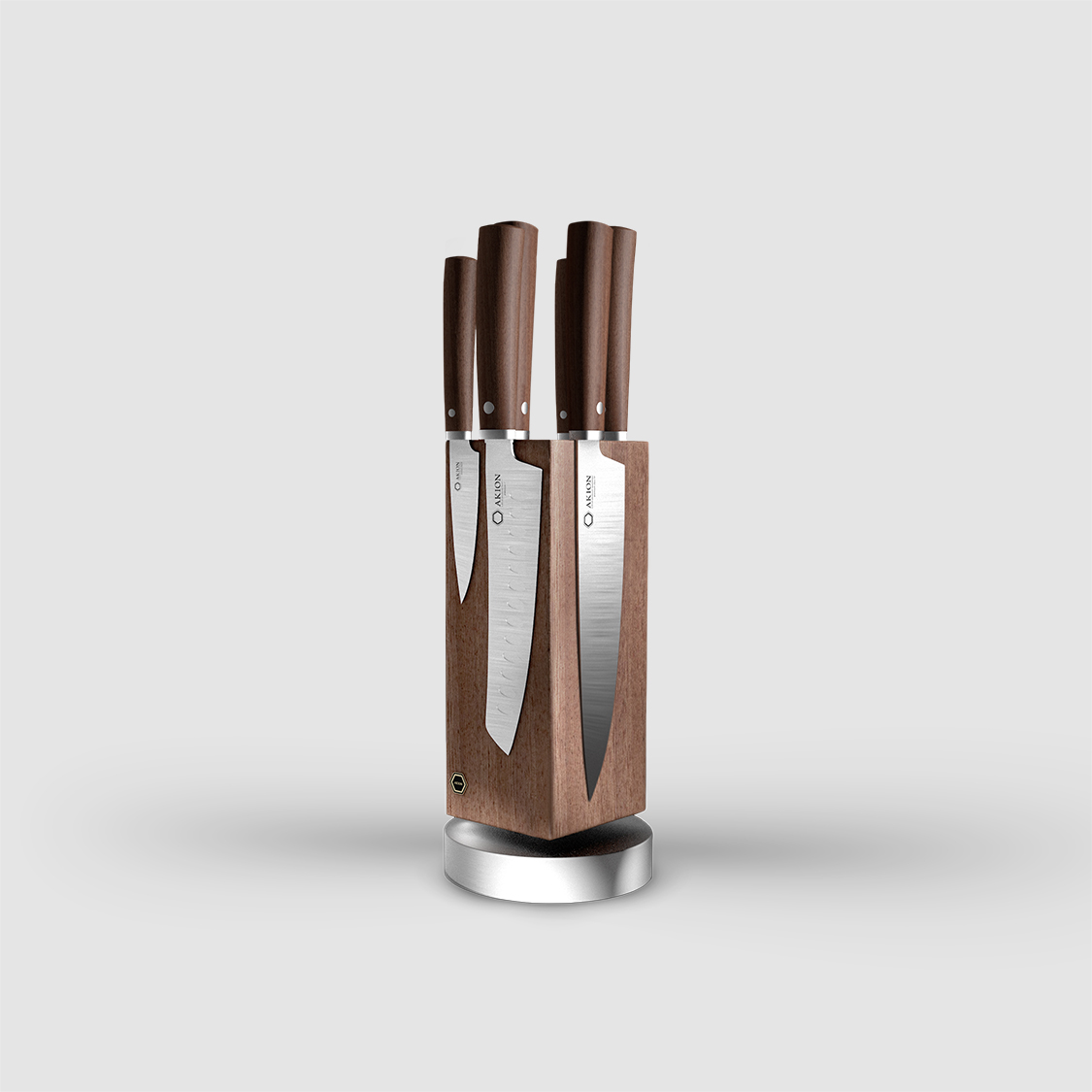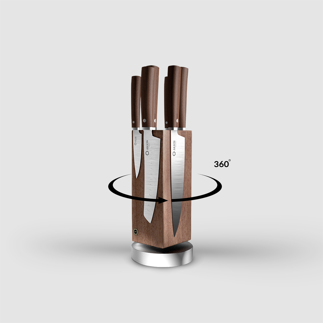 Die einzigartigen Edlen Holzarten interpretieren mit dem runden Aluminium Standfuss und den symmetrisch einzeln angelegten Magneten eine einzigartige 360 Grad drehbare Messerblock Serie für 6 Messer. Die charakteristischen Merkmale der handgefertigten Holzblöcke formen jeden Messer-Block zu einem Unikat.